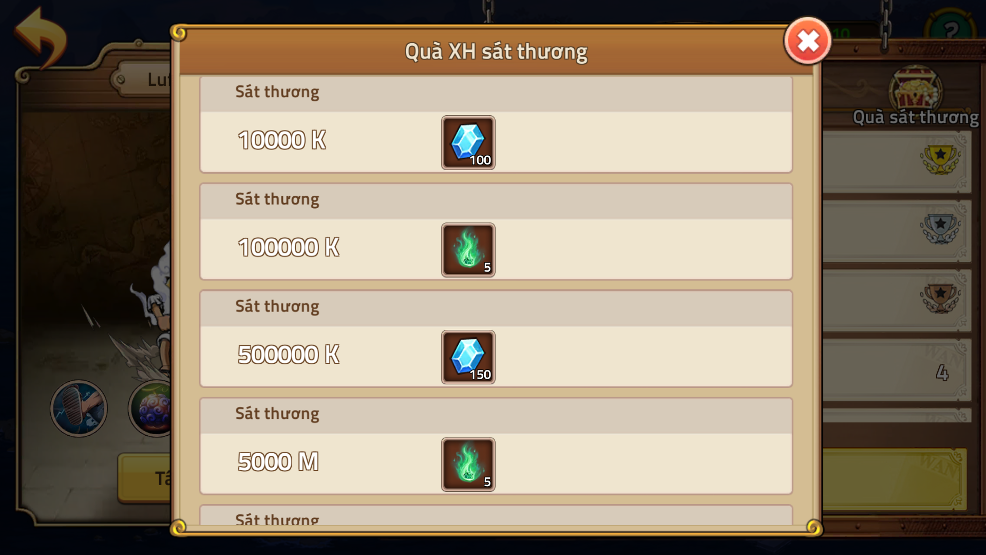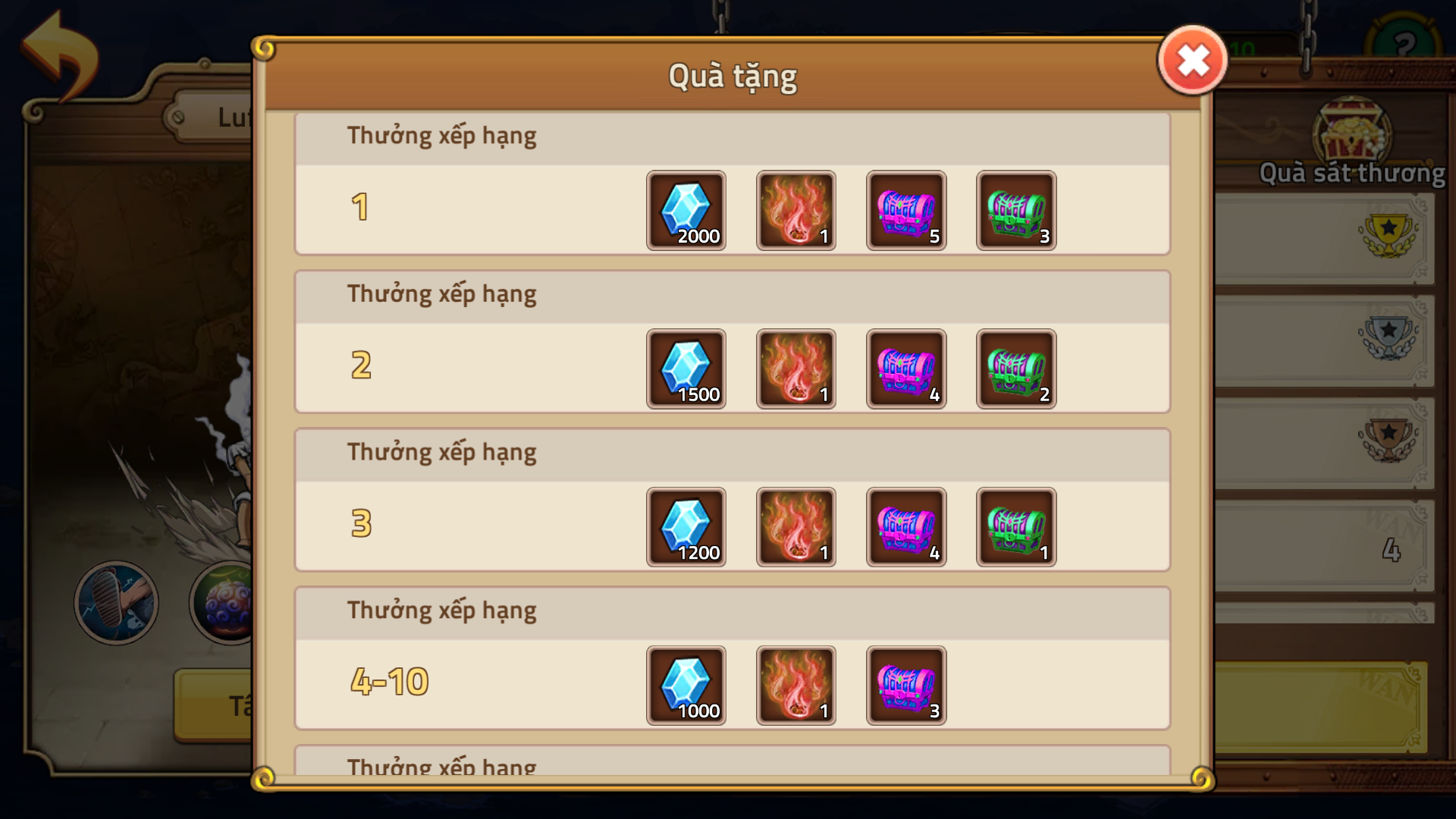 - Thưởng Xếp Hạng: Mỗi ngày sẽ dựa theo sát thương cao nhất mà Thuyền Trưởng đã tấn công Boss Tứ Hoàng để sử dụng làm căn cứ xét điểm xếp hạng trên Bảng Xếp Hạng Sát Thương và cuối ngày sẽ tổng kết nhận quà. (Làm mới mỗi ngày)